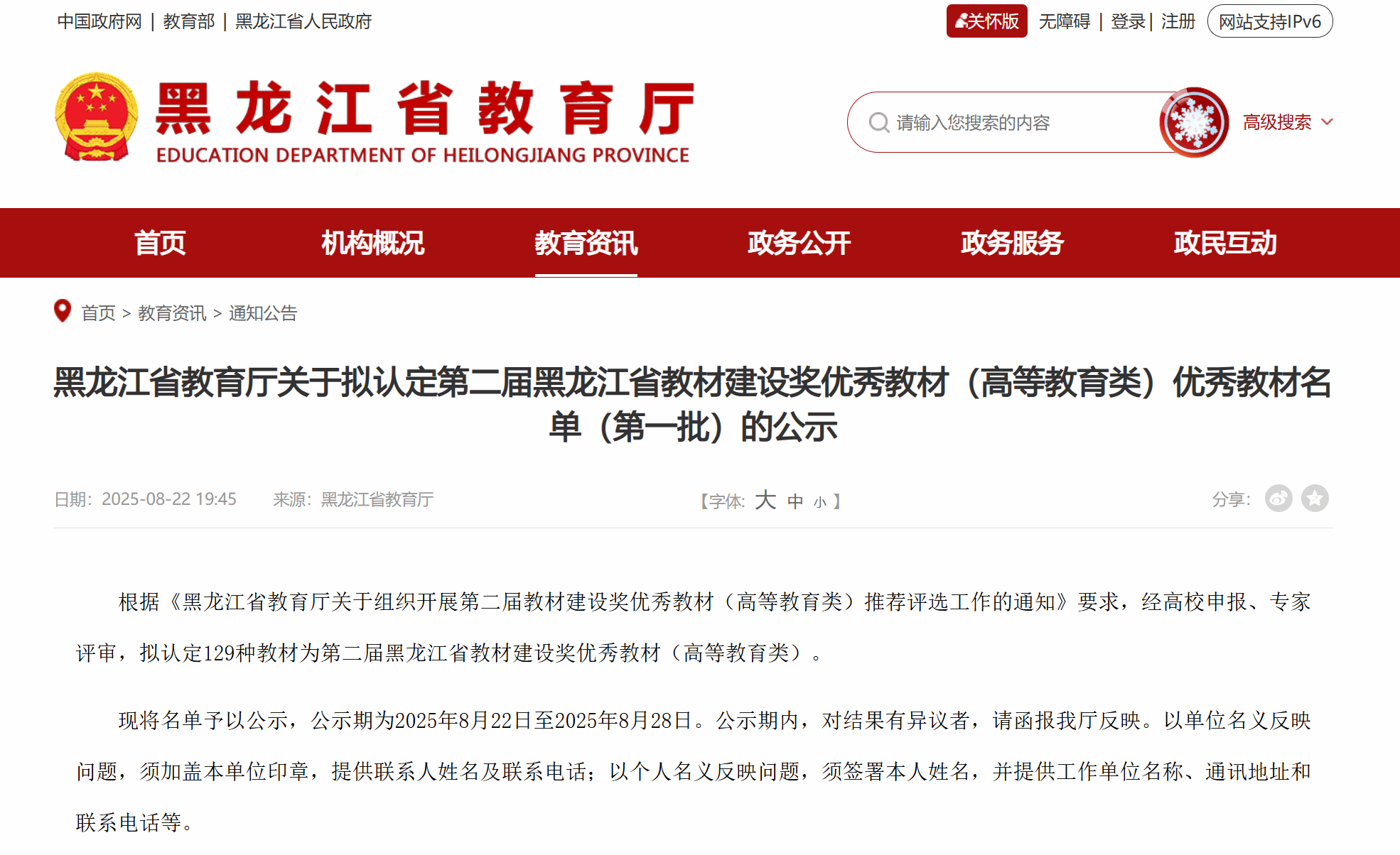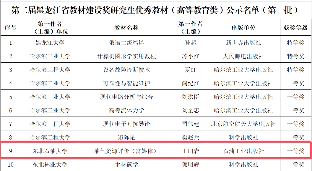 近日,黑龙江省教育厅发布了《关于拟认定第二届黑龙江省教材建设奖优秀教材(高等教育类)名单(第一批)的公示》,经各高校申报、专家严格评审,全省共评选出30部获奖研究生优秀教材(其中特等奖3部、一等奖10部、二等奖17部),万象城有1部教材荣获省级研究生优秀教材一等奖。