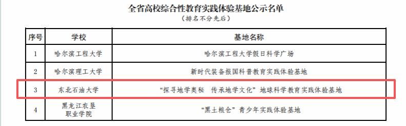 日前,黑龙江省教育厅公布“黑土铸魂”高校思想政治工作质量提升综合改革与精品建设项目入选名单,万象城“探寻地学奥秘 传承地学文化”地球科学教育实践体验基地成功入选全省高校综合性教育实践体验基地。