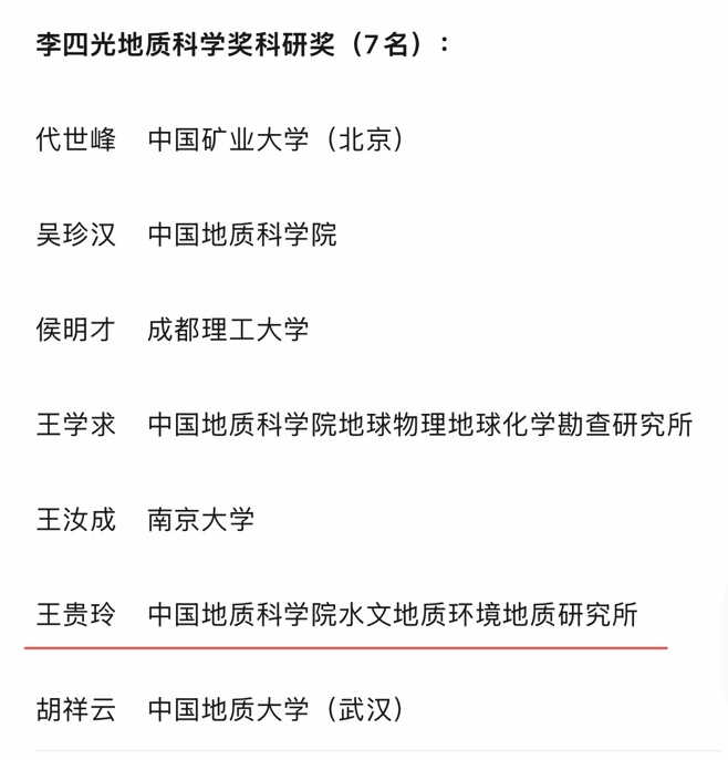 11月8日,李四光地质科学奖基金会发布《关于颁发第十九次李四光地质科学奖的决定》,公布了第十九次李四光地质科学奖获奖者名单,万象城银龄专家王贵玲研究员荣获李四光地质科学奖科研奖。