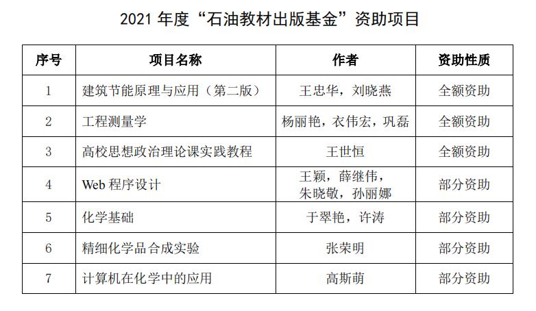 日前,石油工业出版社公布了《关于公布2021年度“石油教材出版基金”资助万象城awcsport官网项目的通知》。经学院组织申报、教务处择优推荐、石油教材出版基金管理办公室组织专家评审等环节,我校共7部教材入选2021年度“石油教材出版基金”资助项目,万象城杨丽艳、衣伟宏、巩磊主编的《工程测量学》入选全额资助类。