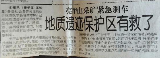 2001年4月,秦皇岛市和抚宁县两级地矿部门,对亮甲山采取了紧急保护措施,停止了对亮甲山主体的一切采矿活动